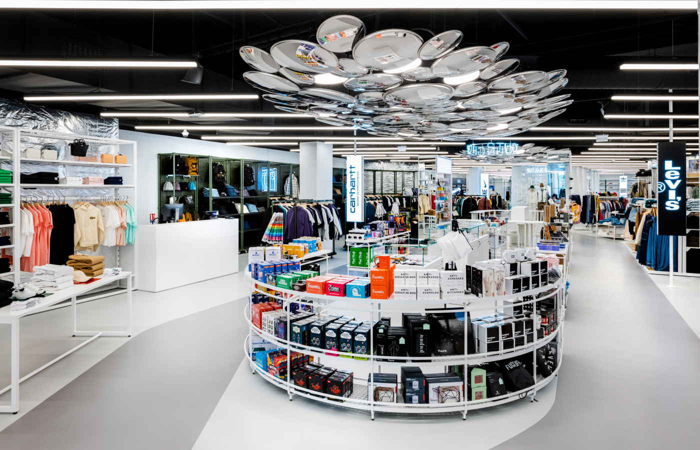 Les indispensables chers à la communauté Citadium sont évidemment présents dans ce nouvel écrin. On y retrouve les marques emblématiques de l'enseigne telles que Nike, Tommy Hilfiger, Vans, Adidas, Veja, Ralph Laurent, Converse, Levis ou encore Lacoste. Mais aussi l'ensemble des collections streetwear, sneakers, accessoires et épicerie américaine déjà disponible dans les autres shops ainsi que des concepts toujours plus innovants.