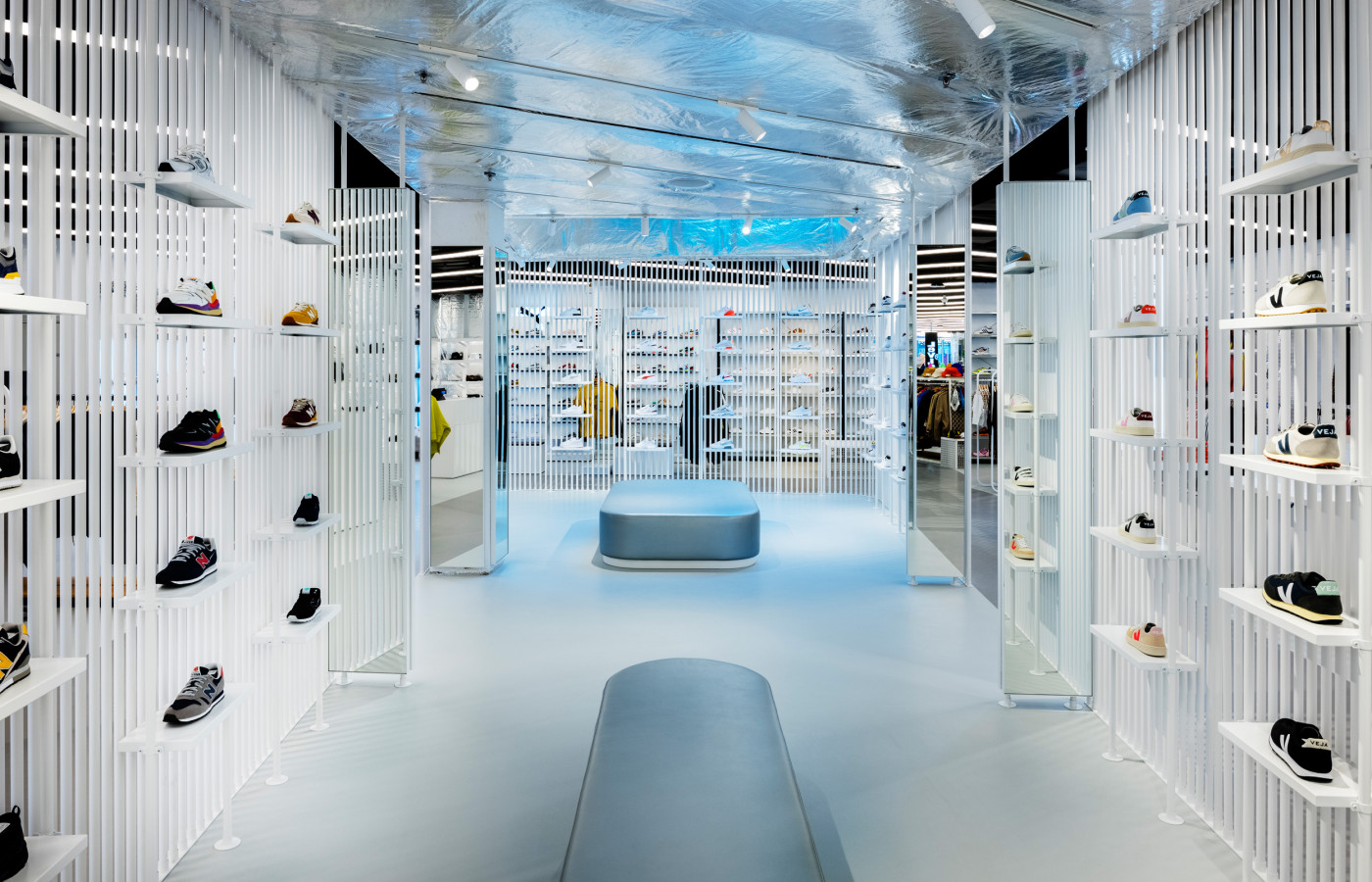 Le magasin s'étend sur un seul et même plateau, un lieu lumineux au tout nouveau concept architectural crée par le cabinet Antonio Virga. La façade, élément signature du flagship, est conçue en verre double peau et donne déjà le ton de ce qu'est ce nouveau store, clair et épuré.