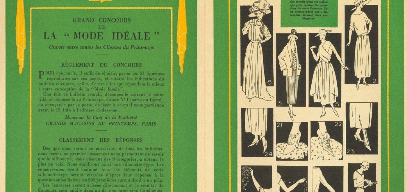 Il y a 100 ans, en 1923, alors que les femmes n'ont pas encore le droit de vote en France, le Printemps organise le « Concours de la Mode Idéale ». Le principe et le règlement de ce référendum inédit, réservé aux clientes, sont illustrés dans un joli dépliant joint au Catalogue de la Saison d'été : pour participer, il suffit de remplir un coupon et de le déposer en magasin ou de l'envoyer par la poste. Parmi les différents modèles de robes de jour et de soirée, celles recueillant le plus de votes constitueront la silhouette idéale, en incluant notamment la coiffure, la place de la taille, la forme des chaussures et des manches. En quelques mots, les principaux éléments de débat sur les nouvelles tendances de mode.