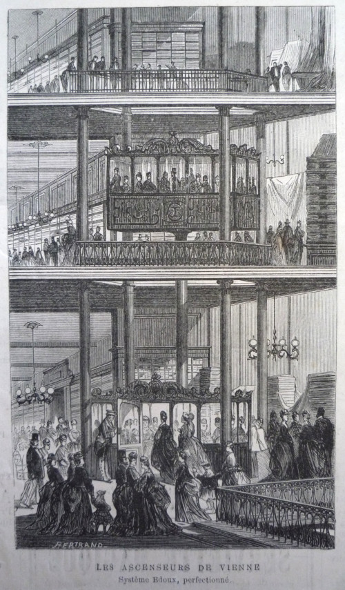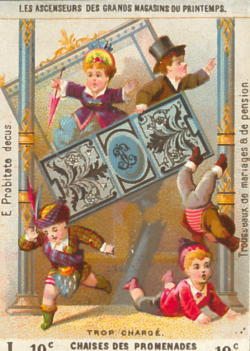 In April 1874, Printemps inaugurated its first elevators in great fanfare. Eager to offer new experiences to its customers, the store did not hesitate to adopt this revolutionary technology, first unveiled just a few months earlier at the Vienna World’s Fair: a hydraulic elevator system, similar to a merry-go-round, whose installation was documented in the magazine “L'univers illustré”. Playing on visitors’ fears, Printemps even distributed advertising chromolithographs depicting... elevator accidents.