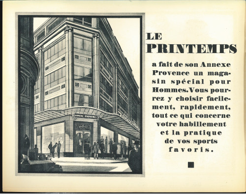 Until then, men had been somewhat neglected by department stores, those temples of retail dedicated primarily to the “Bonheur des dames”, or the happiness of women. Although men’s departments at Printemps first appeared in 1878, they were frequented more often by wives than husbands. In 1925, Printemps set out to conquer this huge market by dedicating an entire building to gentlemen and their leisure activities.