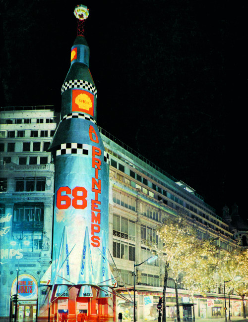 For Christmas 1968, Printemps set out to conquer space! One year before a man walked on the moon, one of the department store’s corner turrets was transformed into a 60-meter-high rocket: a metal-framed replica of the Saturn V.