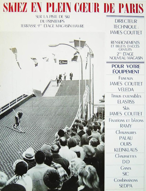 In 1964, Printemps Haussmann transformed its rooftops into an incredible ski slope, the very first in the heart of Paris! Four years before the Grenoble Winter Olympics, this daring installation enabled Parisians to show off their athletic skills or learn the joys of downhill skiing, while giving the panoramic terrace, perched 50 meters high, an irresistible air of “Chamonix-sur-Seine”.
