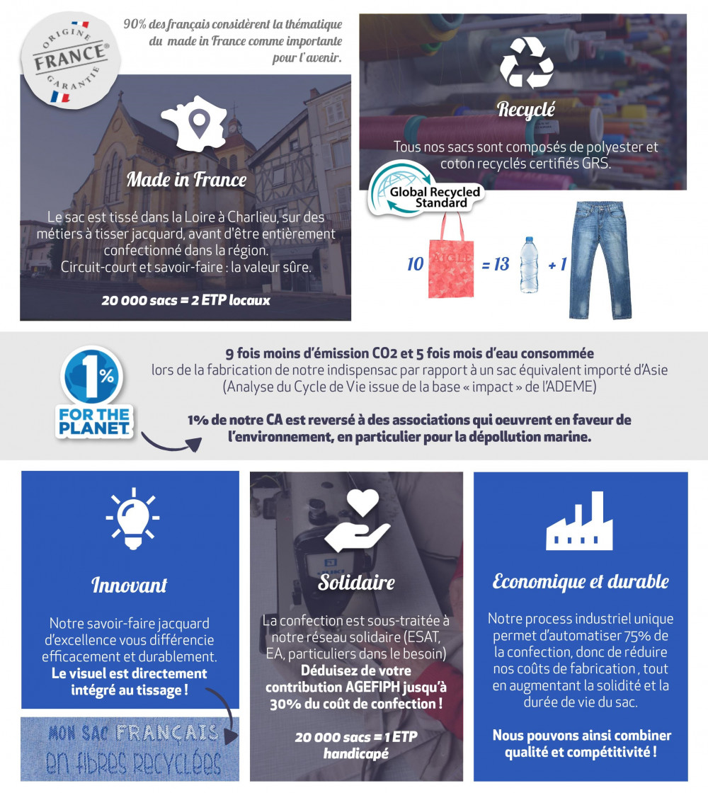 The recycled fibre is European, both in terms of the spinning and the collection of the bottles, and is GRS (Global Recycling Standard) certified by an independent organisation, guaranteeing its traceability. In addition, the product is made using jacquard weaving, which preserves French know-how, while avoiding printing and polluting inks.