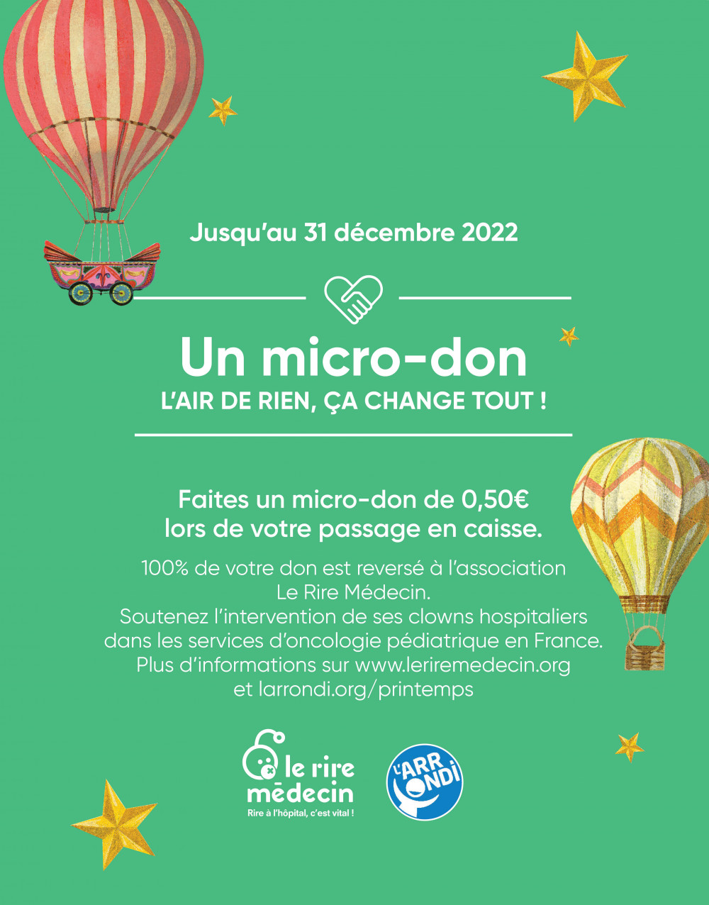 The holidays are the perfect time to witness generosity. Now through December 31, 2022, give a micro-donation of €0.50 at checkout 100% of your donation will go to Le Rire Médecin. Support the efforts of the hospital clowns who bring cheer to pediatric oncology services across France.
