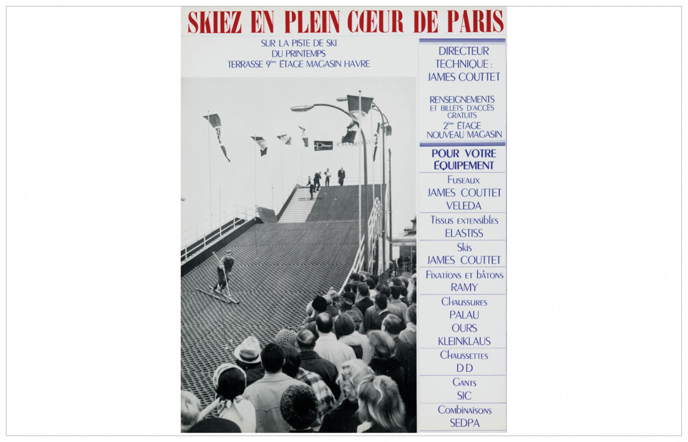 In the 1960s, skiing opened up to the masses. And in 1964, four years before the Grenoble Olympics, Printemps offered Parisians the first artificial ski slope in the middle of the city for several seasons, turning its panoramic terrace sitting at a height of 50 meters into a mini Chamonix-sur-Seine.