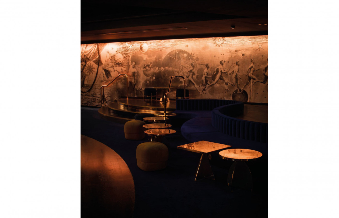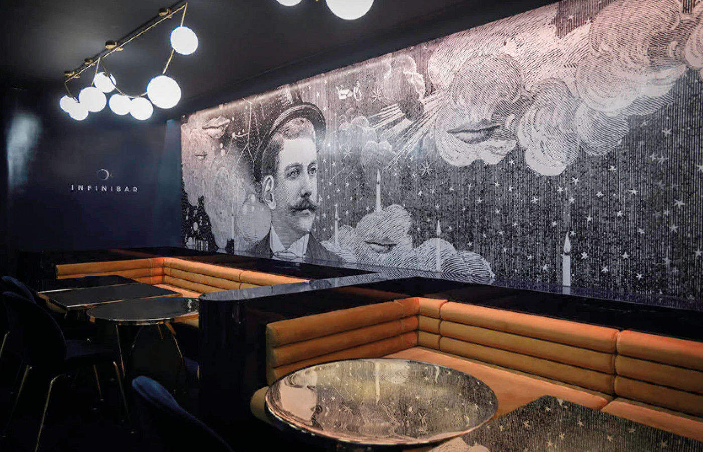 The result is a futuristic new space. The Infinibar invites visitors into an “elliptical space where time disappears and the stage crystallizes into focus.”