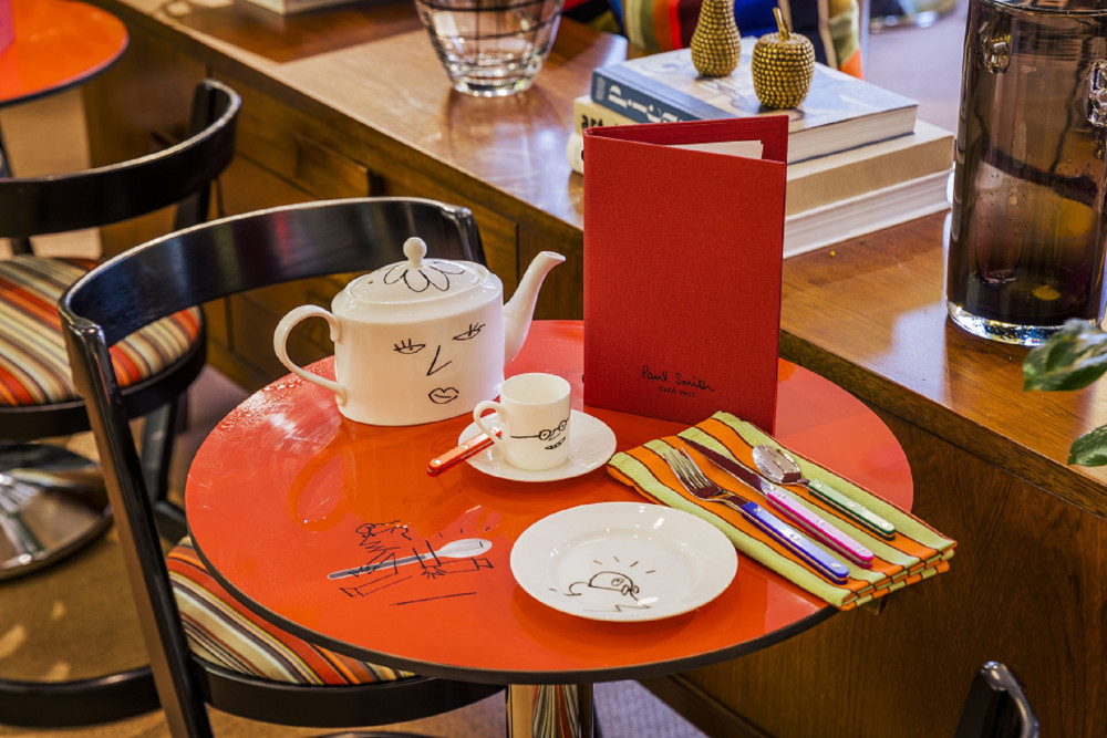 Decorated in a vibrant color palette, the Paul Smith Café draws inspiration from the brutalist architecture and domestic interiors of the mid-20th century. Inside, an eclectic mix of vintage furniture from the 50s, 60s and 70s, as well as chairs reupholstered with a custom fabric in Paul Smith colors and stripes.
