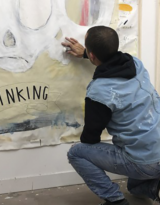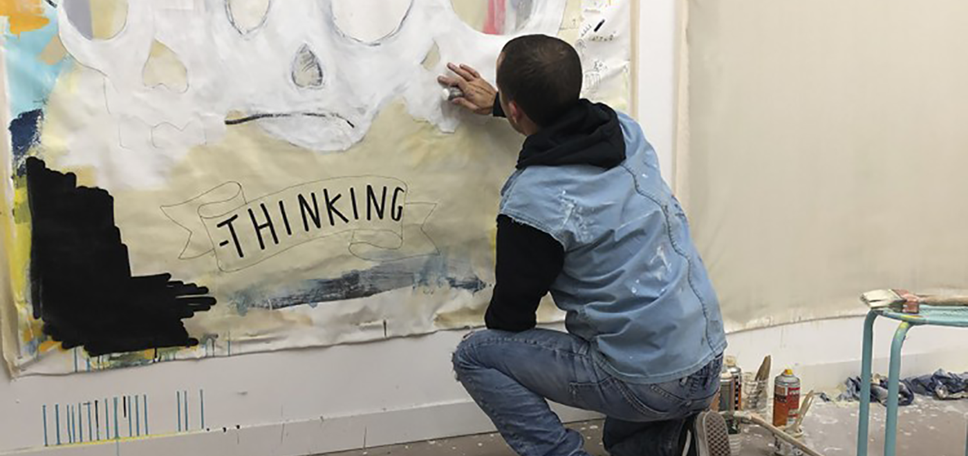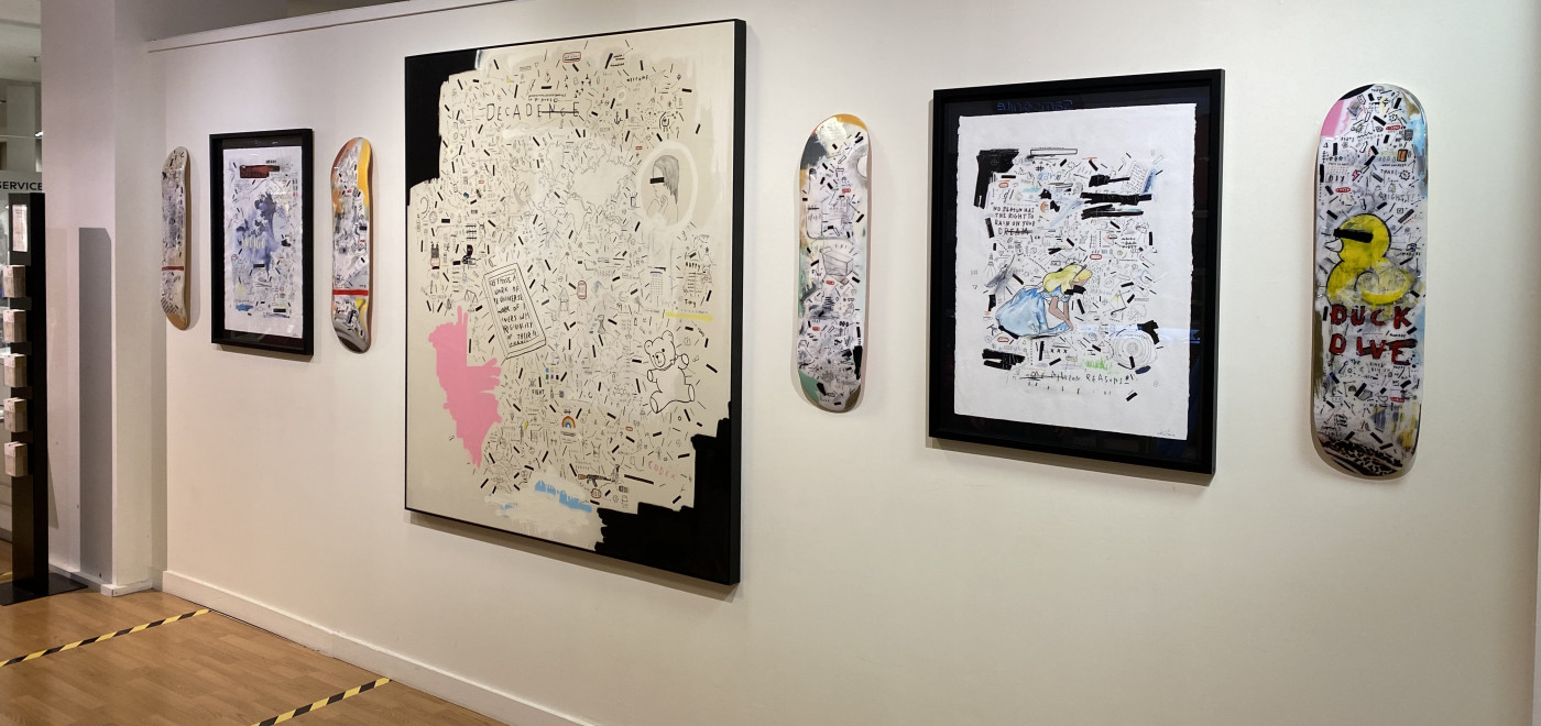 Passionate about resin, surf-culture and freestyle customisations, Sébastien creates work that represents the skater generation, the punk attitude and a counterculture open to all types of shapes and visual experiments. Each of his works is created using mixed media (acrylic, markers, lead pencils and collage).