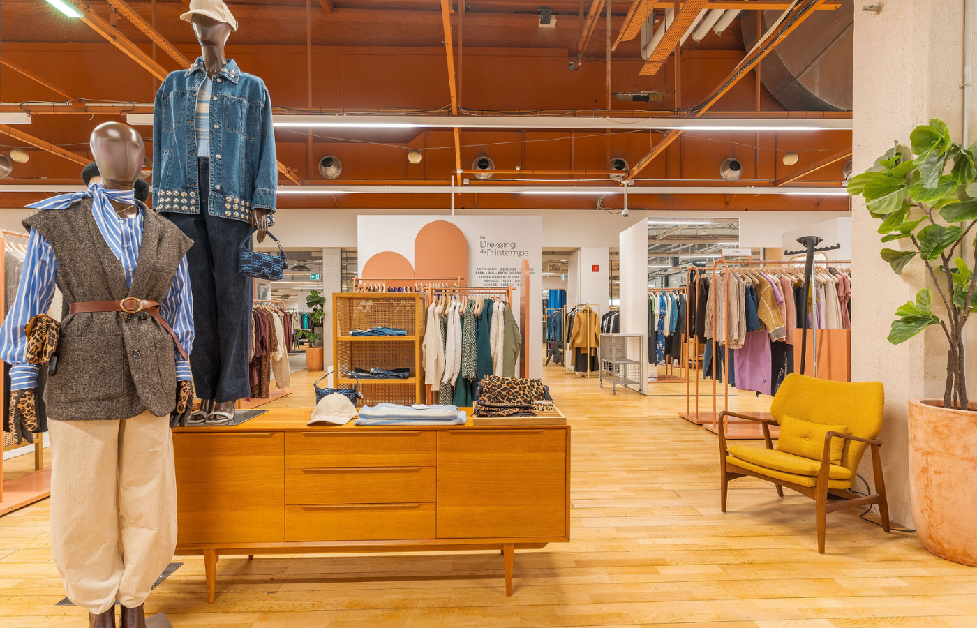 The Printemps group is committed to a responsible approach to reducing the environmental impact of its activities and guaranteeing the comfort of its customers and employees. A charter has been drawn up and applies to all construction operations: materials are chosen with this in mind, and waste is recycled. On this project, for example, the fabrics used for the ceiling kakemonos were recycled through two collaborations: with Enola Couture Création, a sewing association, which uses them to teach sewing, and with Gaëtan Marron, an artist from Marseilles, who uses them as a support for the creation of a fresco. Other examples of eco-responsible actions include the use of recycled materials to make new curtains for the fitting rooms, and the switch to LED lighting, which has a positive impact on the store's energy consumption.