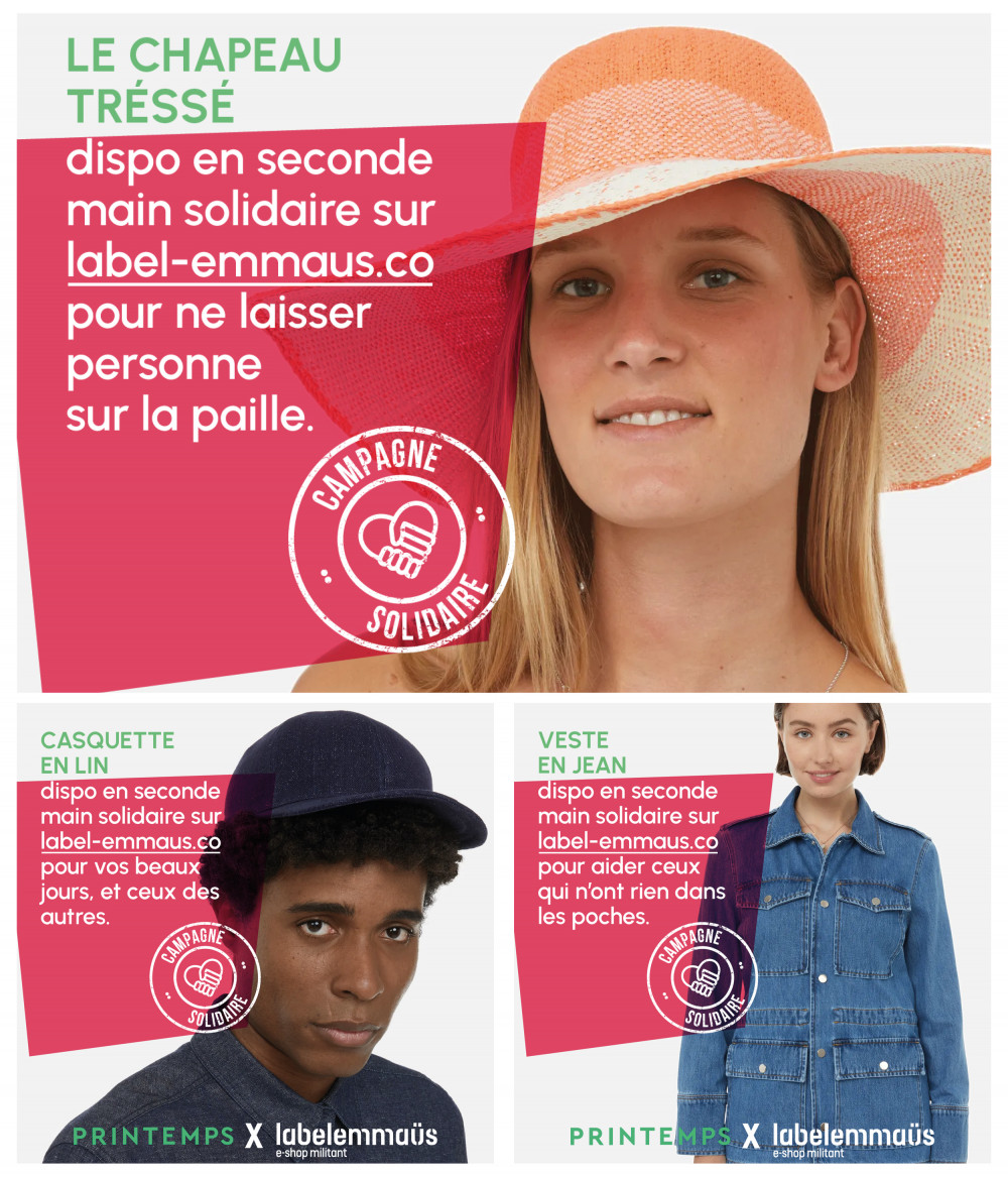 Printemps has committed to support Label Emmaüs, through a charity campaign and donations from past collections of Au Printemps Paris, currently featured at https://www.label-emmaus.co/fr/