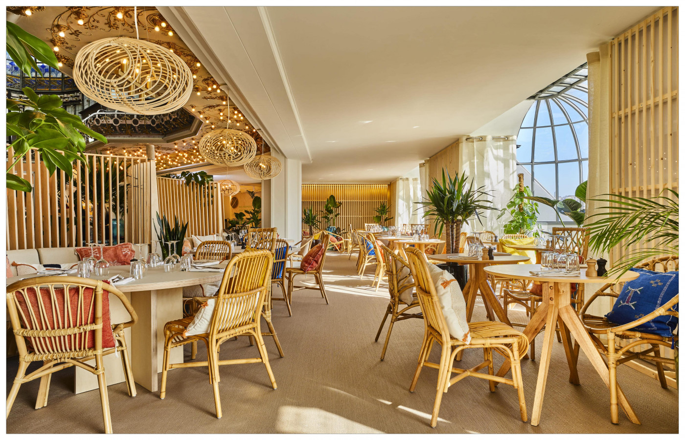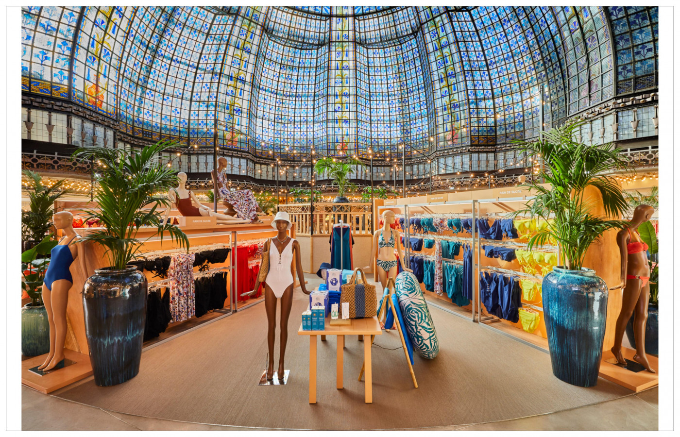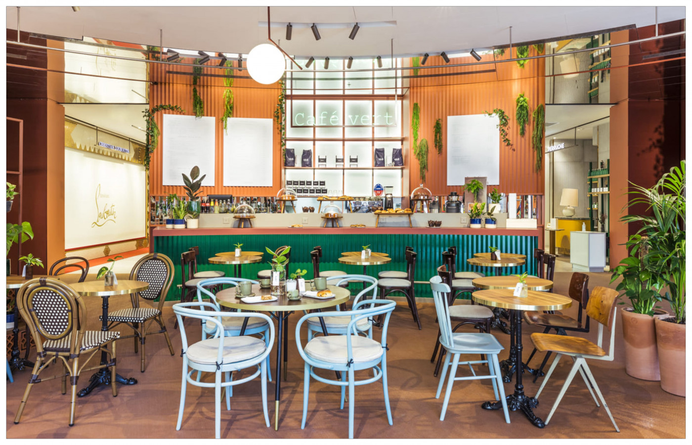 Certain spaces alternate between experiences & retail, such as the Bleu Couple restaurant, which shares the Wybo cupola with La Plage, a pop-up multi-brand market space, or Café Vert, a green cafe where plants intermingle with coffee beans. Other spaces combine spectacle & trends with the panoramic view from the 7éme Ciel terrace, the climbing wall at Au Vieux Campeur and the Machi Machi bubble tea cafe.